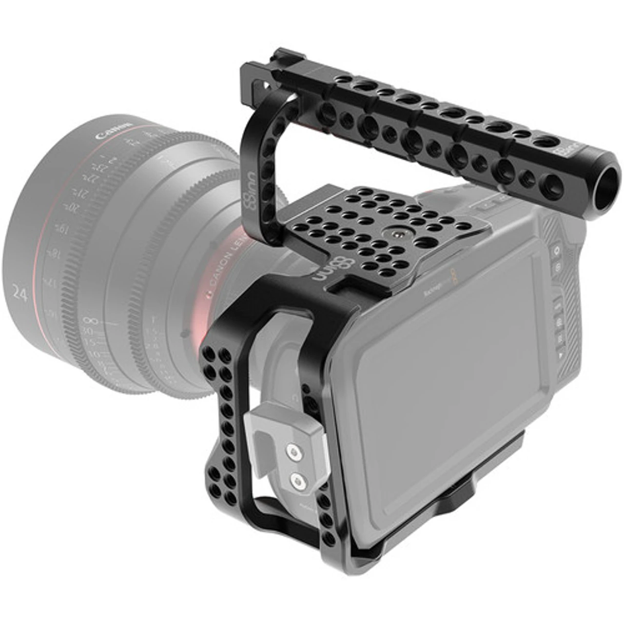 The Half Cage with Top Handle Basic for Blackmagic Design Pocket Cinema Camera 4K/6K from 8Sinn is a CNC-machined, anodized aluminum half cage with integrated accessory mounting holes specifically designed for the BMPCC 4K and BMPCC 6K, plus a removable top handle. The half cage features mounting holes on the top and bottom that align with your camera’s top and bottom 1/4″-20 mounting points, as well as two locating pins that help prevent the camera from twisting in the half cage. A built-in cold shoe and threaded 1/4″-20 mounting holes allow you to mount accessories without stressing your camera’s body.