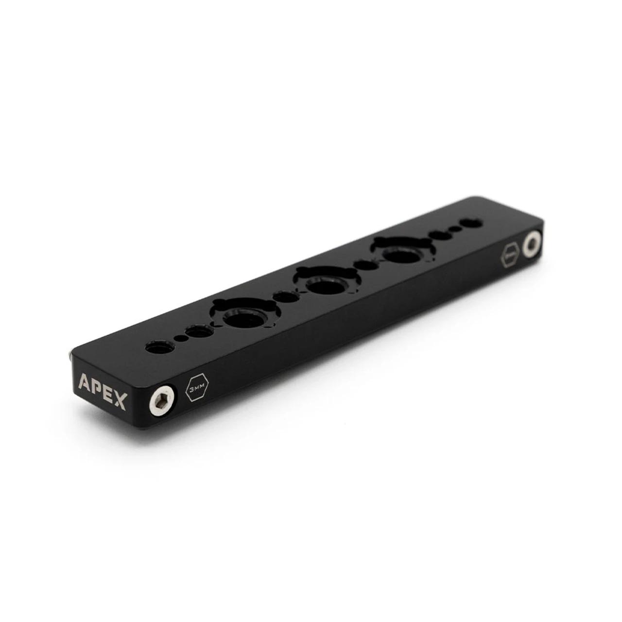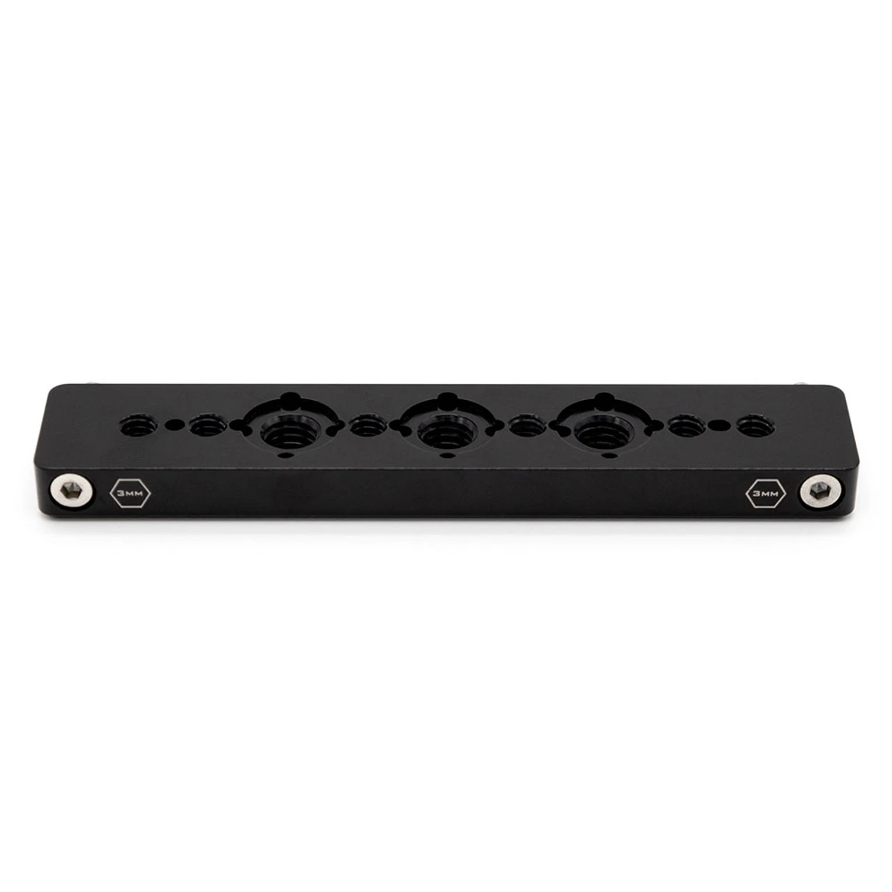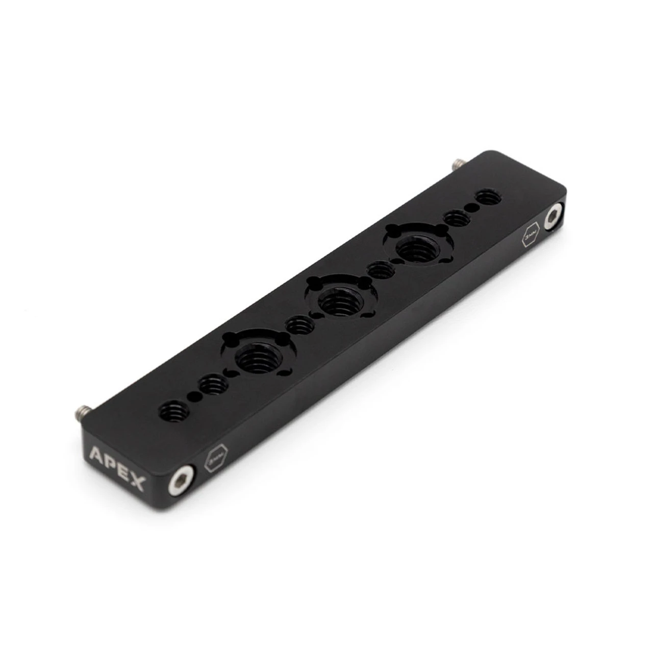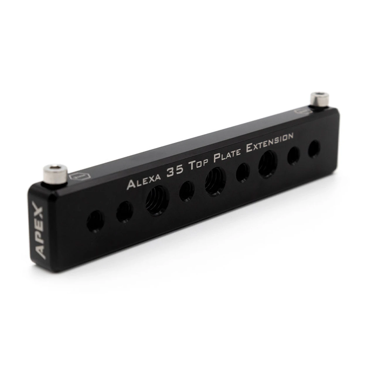 The Apex Cinema Gear ALEXA 35 Top Plate Extension mounts seamlessly and effortlessly to the ARRI Top Plate on the Alexa 35, providing additional 1/4″-20 and 3/8″-16 threaded mounting holes for mounting accessories. It is profiled exactly to match the Arri Top Plate and attaches using two provided captive M4 socket head bolts that screw into the rear of the top plate on the camera.