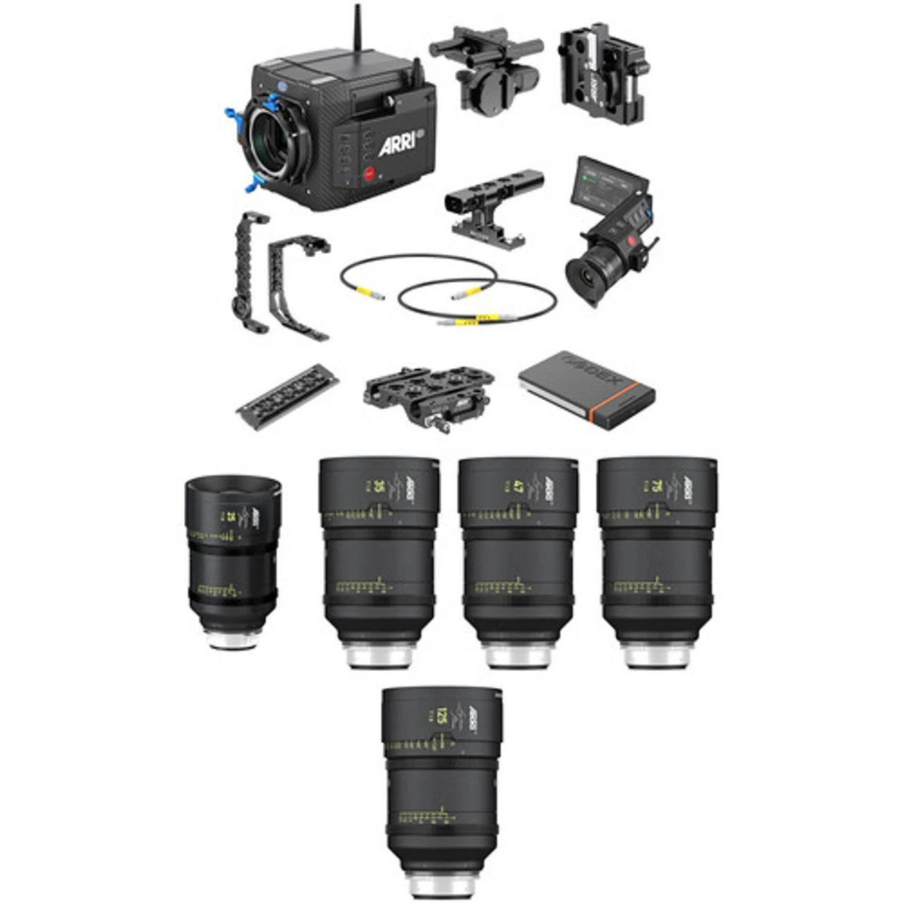 The ARRI ALEXA Mini LF Ready to Shoot Gold Mount Set (LPL) with 5x Signature Prime Lenses is a cost-saving kit combines five LPL-mount Signature primes with an ALEXA Mini LF camera set incorporating a PL-to-LPL lens adapter, a 19mm Studio baseplate with a 15mm insert, a Gold mount splitter box, an MVF-2 HDR EVF, two 1TB Codex drives, cage components, and other essential camera components. The five-lens Signature prime set consists of 25, 35, 47, 75, and 125mm lenses, spanning a commonly used range of focal lengths.