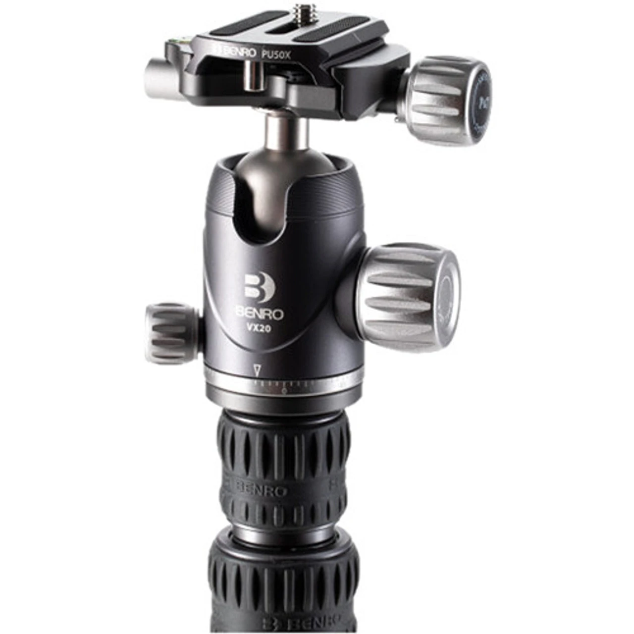 The VX20 ball head features dual panoramic mode, which allows panning head from its base and also from the quick release platform. The controls are simple with ball friction adjustment built into the main lock knob, plus an independent pan lock. It includes a PU50X quick release plate and features a quick release plate safety lock.
