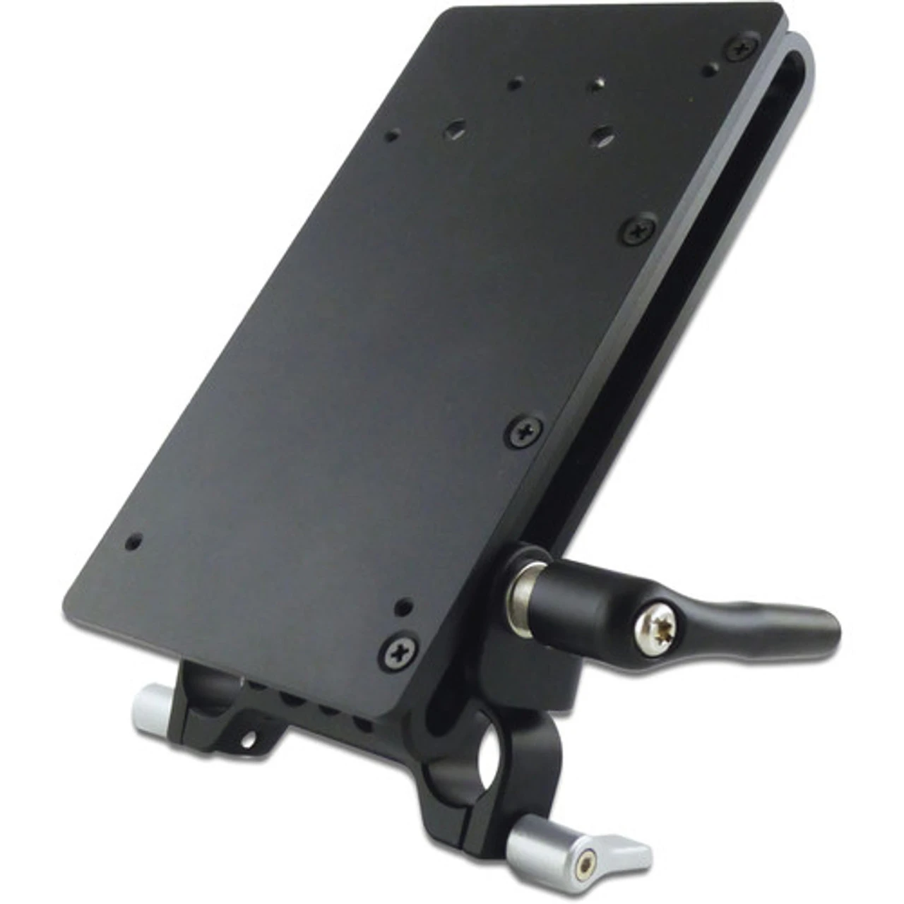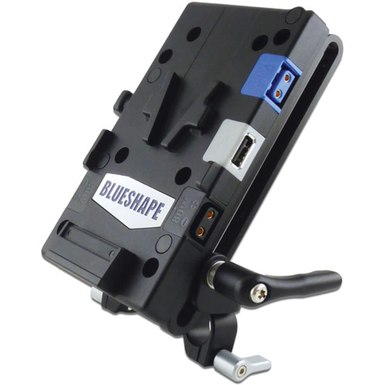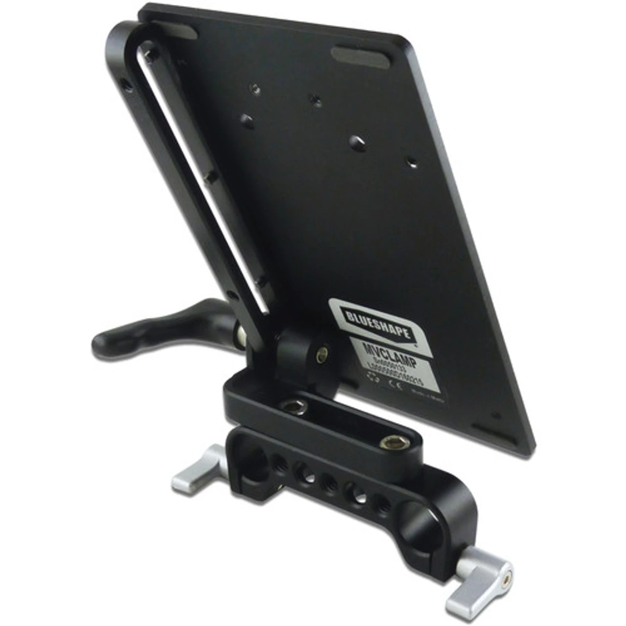 The MVCLAMP Adjustable Rod Clamp for Multi-Power Plates from BLUESHAPE incorporates the Wooden Camera rod clamp for an existing 15mm rod system with a customized backplate provided with screw holes for installation of MVFULL, MVBASIC, MVAM, and MVUSB (sold separately). The mounting system is adjustable, which allows for setting the counterbalance and for transitioning from studio to handheld mode. The user can simply apply firm pressure to tilt the plate in place, and loosen the thumbscrew to slide the plate up and down, adjusting the tilt.