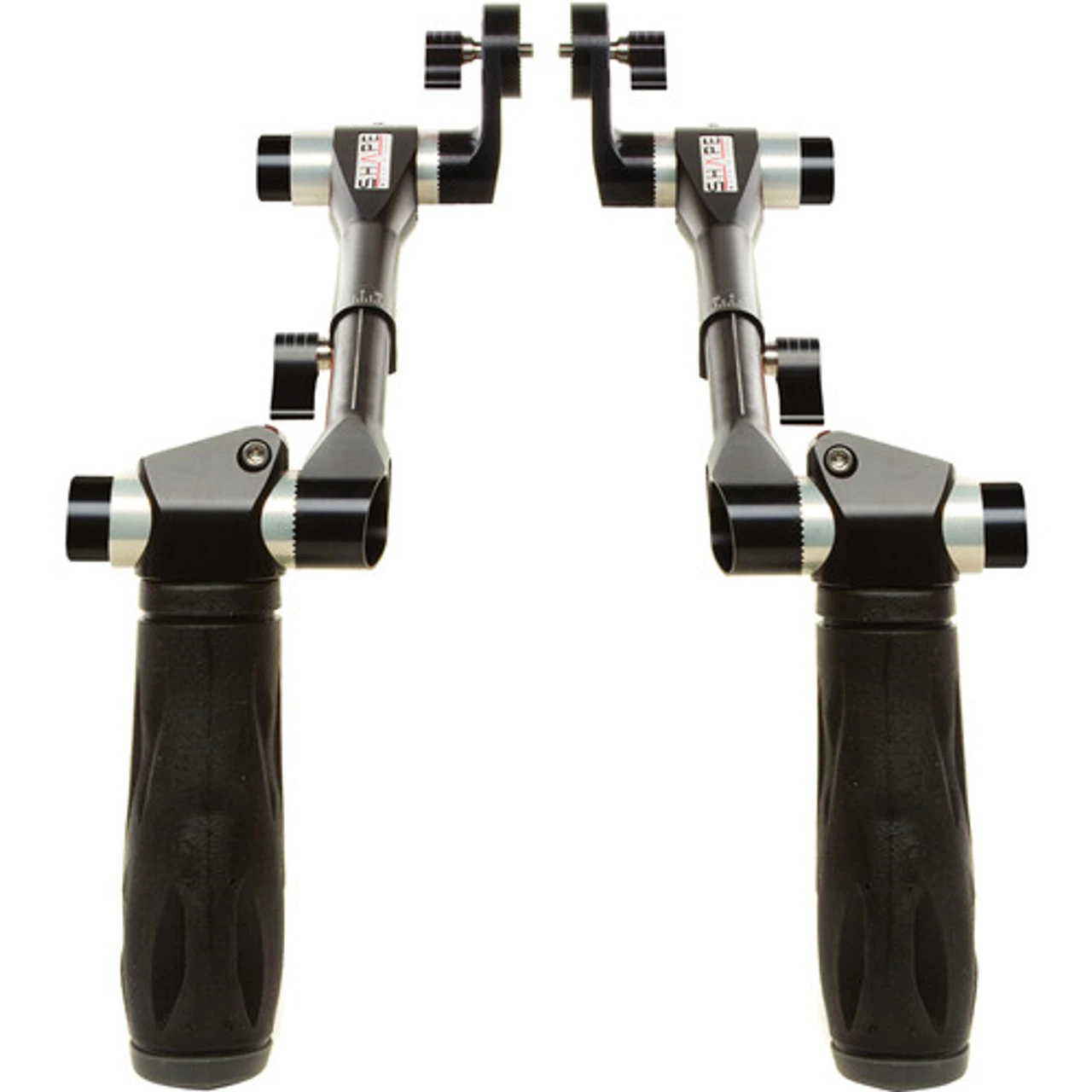 The black Telescopic Handles with ARRI Rosettes from SHAPE are left and right handgrips that can be attached to cameras and camera support hardware that has standard ARRI rosettes. Each arm features three points of articulation, combined with the approximately two inches of arm extension allows you to adjust the arms for your comfort. The arms attach to your camera or support via an ARRI compatible rosette with spring-loaded locking levers, which allow you to lock your arms in place without having a full 360° of rotation.