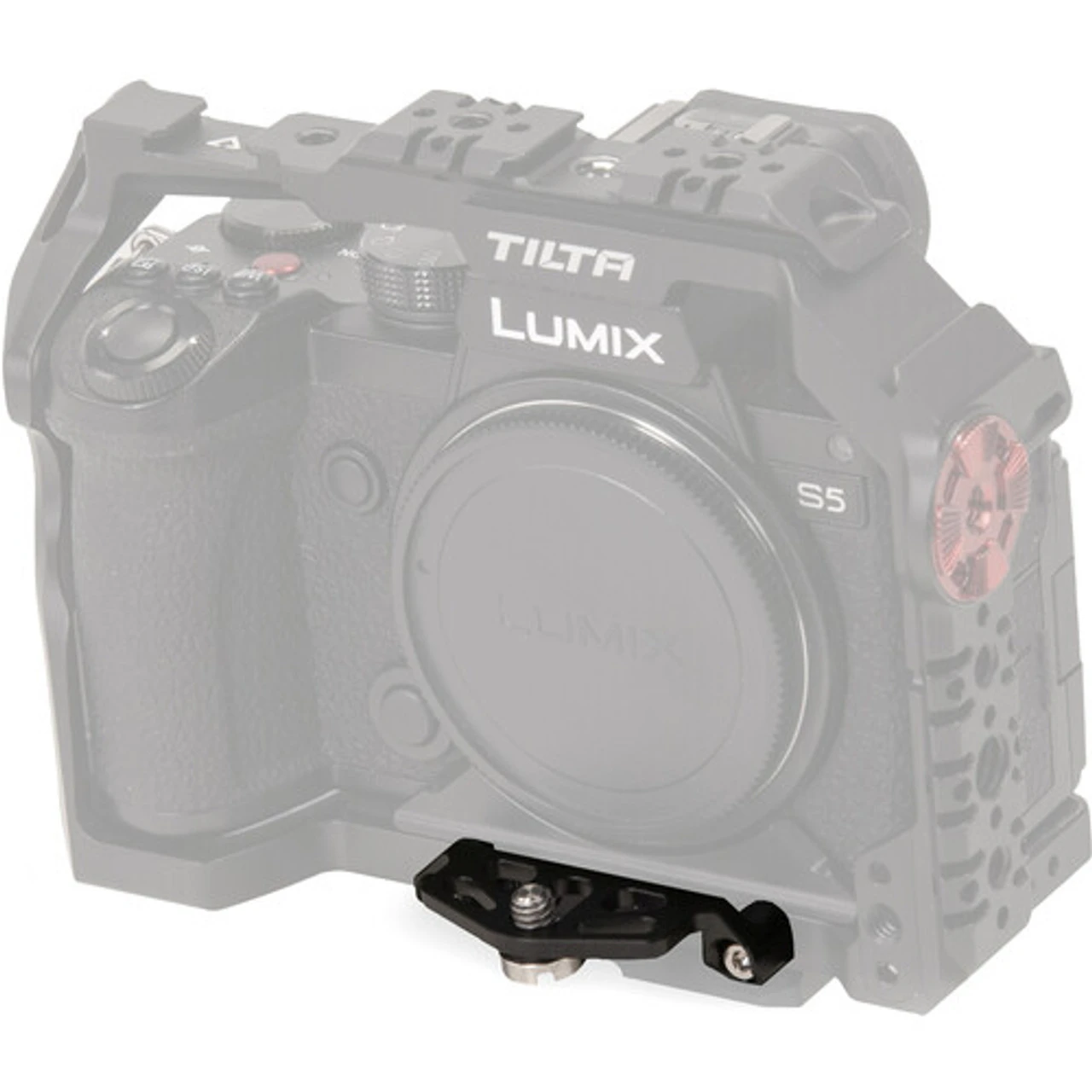 The PL Mount Adapter Support, in black, attaches to the front of the Tilta camera cage for the Panasonic S5 to provide support for PL lens mount adapters. The attachment screw holes are slotted to allow a bit of vertical adjustment, for compatibility with virtually all adapters. A support screw is also included and can be secured to the bottom of compatible adapters.